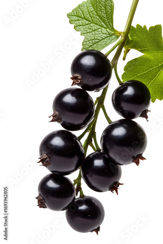 © Seek, Fototapeta premium Freshly harvested black currants on branch with green leaves and transparent background