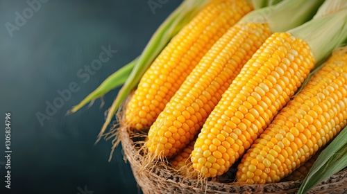 © FoxGrafy, Fototapeta premium Freshly harvested corn cobs in a rustic basket