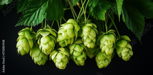 © olegganko, Obraz premium Freshly Harvested Hops Hanging From the Vine in a Garden During Summer.