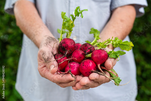 © Rawpixel.com, Fototapeta premium Freshly harvested radishes in hands