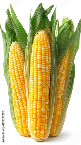 © Ramjan, Obraz premium Freshly harvested sweet corn cobs bursting with vibrant yellow kernels and lush green husks, perfect for summer recipes and healthy eating inspiration.