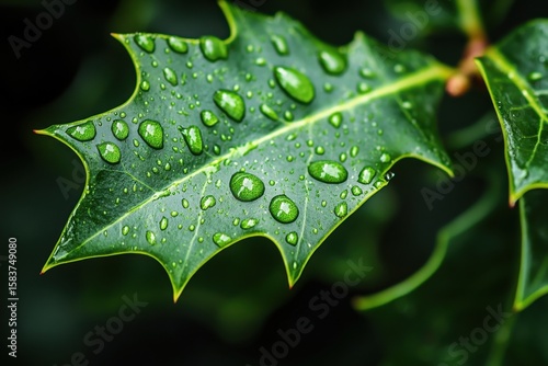 Fototapeta premium Freshly raindropped holly leaf glistens in the lush greenery after a summer...