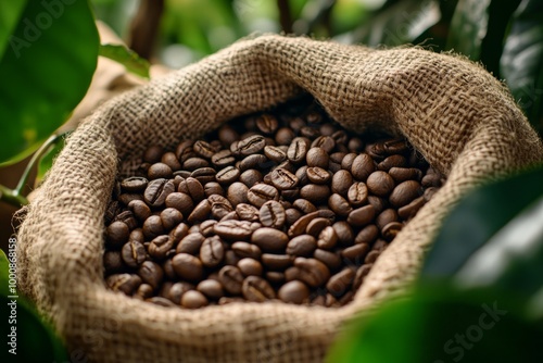 Fototapeta premium Freshly roasted coffee beans are resting in a burlap sack. This image...