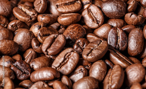Fototapeta premium Freshly roasted coffee beans background.Dark roasted coffee beans with scoop...