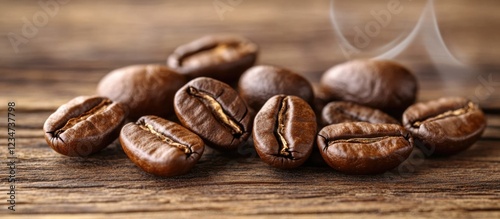 Naklejka premium Freshly roasted coffee beans placed on a rustic wooden surface with a slight steam indicating warmth and freshness Copy Space