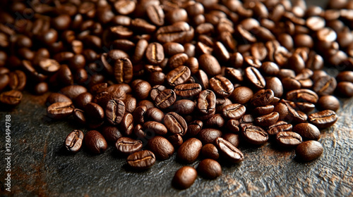 Naklejka premium Freshly roasted coffee beans scattered on a dark surface