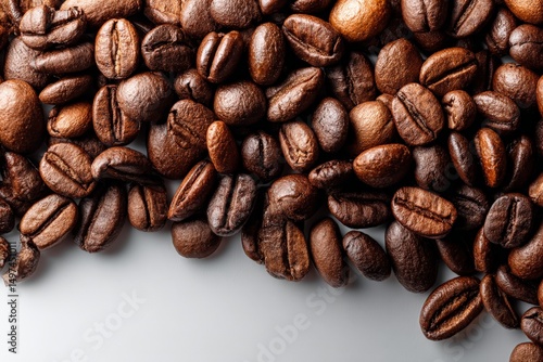 Naklejka premium Freshly roasted coffee beans scattered on a light surface showcasing rich...