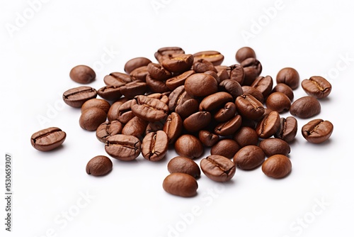 © Md, Naklejka premium Freshly roasted coffee beans scattered on a white background for beverage advertising