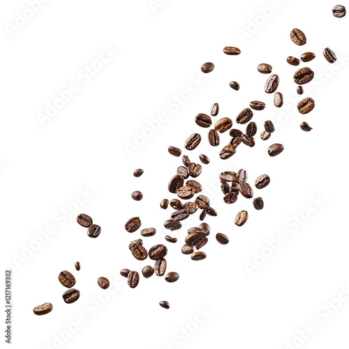 Obraz premium Freshly roasted coffee beans suspended in mid air on a clean white background