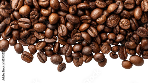 © Trisha, Naklejka premium Freshly Roasted Coffee on White: A flat lay of freshly roasted coffee beans with rich brown color, isolated on a Transparent background, PNG file.