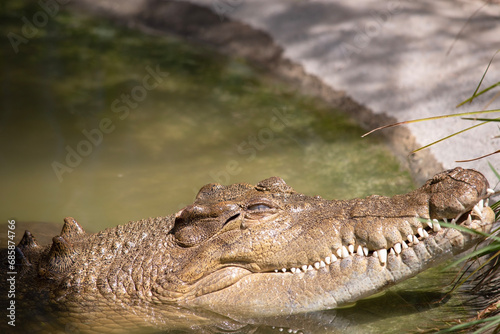 Obraz premium Freshwater crocodiles are grey or olive-brown with ragged dark mottling.