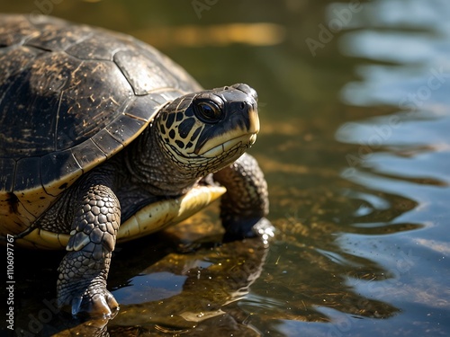 Fototapeta premium Freshwater turtle basking in sunlight.