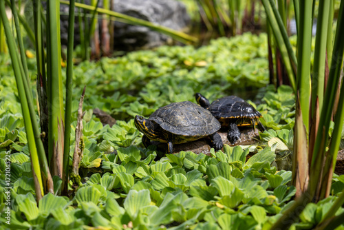 Obraz premium Freshwater turtles basking on rock among aquatic plants in pond, symbol of...