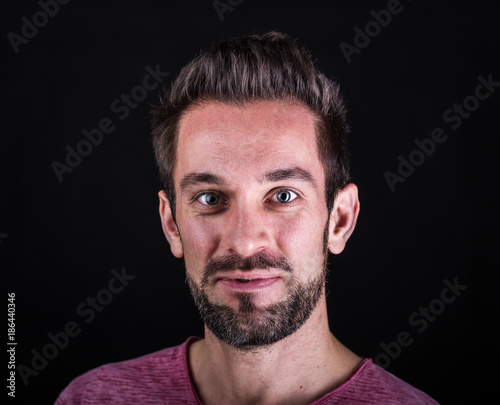 Obraz premium Freudig gestimmter Mann vor schwarzem Hintergrund