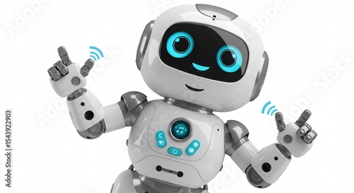© Nguyen, Fototapeta premium Freundlicher Roboter tanzt fröhlich hell beleuchtet. AI Generated
