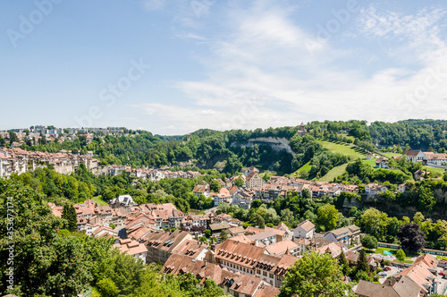 © bill_17, Fototapeta premium Fribourg, Freiburg, Altstadt, Altstadthäuser, Sarine, Saane, Fluss, Unterstadt, historische Häuser, Auquariter, Stadtmauer, Türme, Sommer, Schweiz