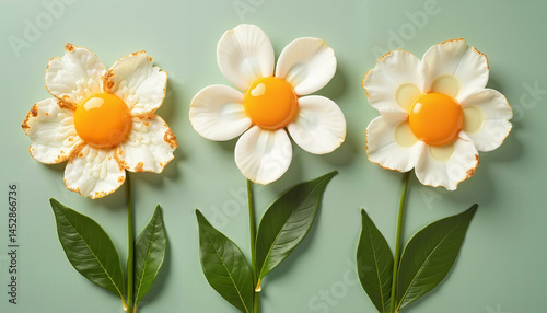 © Nataliya, Fototapeta premium Fried egg flowers, creative, spring themed on green background
