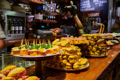 © Juanma, Fototapeta premium fried egg with green peppers "Pintxos" in San Sebastian