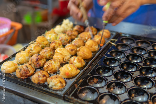 © Scottiebumich, Naklejka premium Fried eggs vegetable balls at a roadside stall in Northern Thailand