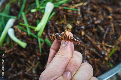 © vladimirzhoga, Fototapeta premium Fried grasshoper at the night food market in Cambodia