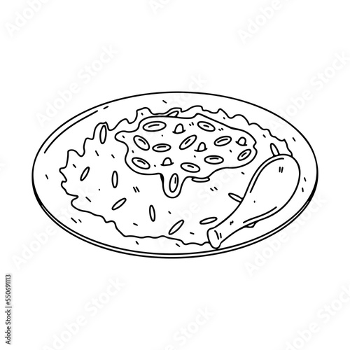 Fototapeta premium Fried rice with roasted chicken and beans sauce in hand drawn doodle style....