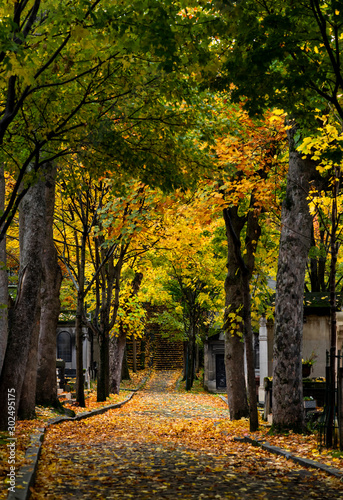 Naklejka premium Friedhof Paris Père-Lachaise Bäume Weg Allee Herbst Laub Regen Gräber berühmt Frankreich