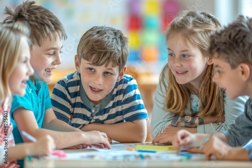 © Kevin, Fototapeta premium Friendly boys and girls brainstorming in teams, Generative AI