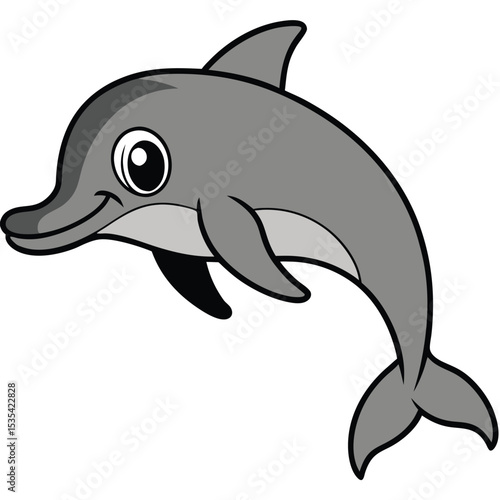© ForhadGFX, Naklejka premium Friendly cartoon dolphin swimming upward with a happy expression against a white background