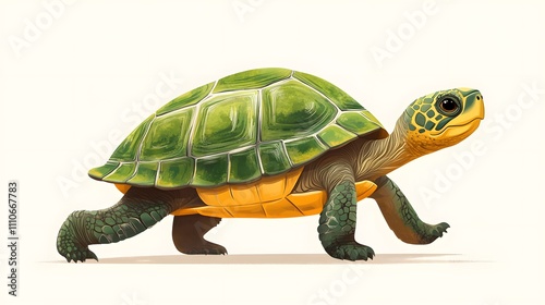 © zooo, Obraz premium Friendly cartoon turtle with detailed green shell pattern and yellow-brown underbelly, presented in side view walking pose with textured scales in children's book illustration style.