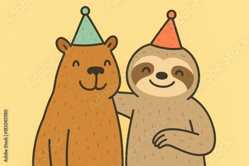 © Thitiporn, Obraz premium Friendly Celebration: A cheerful brown bear and a gentle sloth stand side-by-side, each adorned with festive party hats, embodying friendship and joy