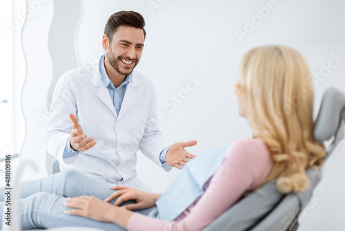 © Prostock-studio, Fototapeta premium Friendly dentist having conversation with blonde woman patient
