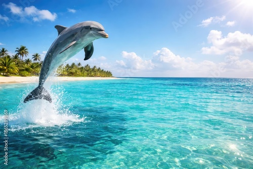 Obraz premium Friendly dolphin leaping from warm Caribbean water with copyspace for text
