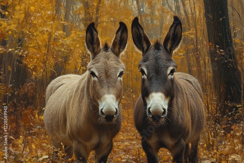 © tiger, Fototapeta premium Friendly Donkeys Play in Autumn Pasture on Texas Farm