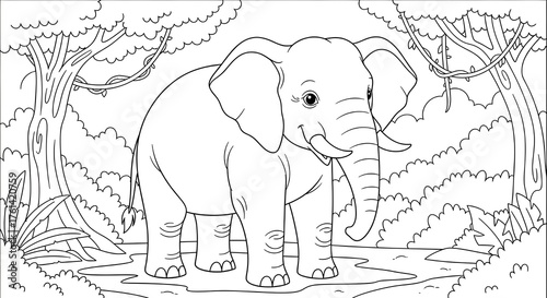 Naklejka premium Friendly elephant in lush jungle scene for coloring fun