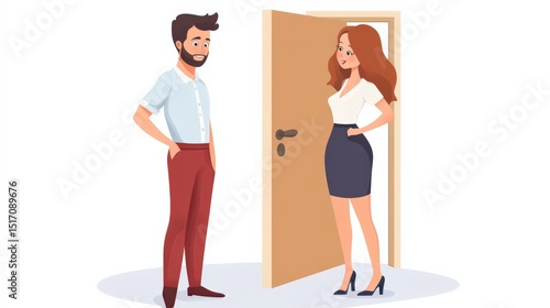 © 4AXY, Naklejka premium Friendly Encounter Between Two Colleagues at Office Doorway