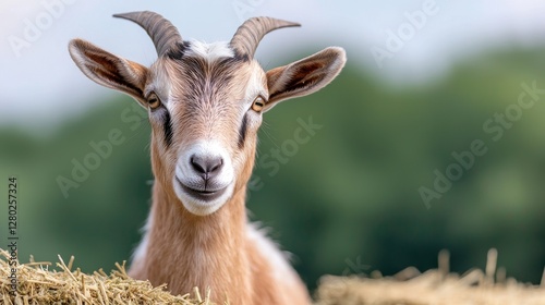 © KUTIL KURO, Fototapeta premium Friendly goat farm portrait, hay background