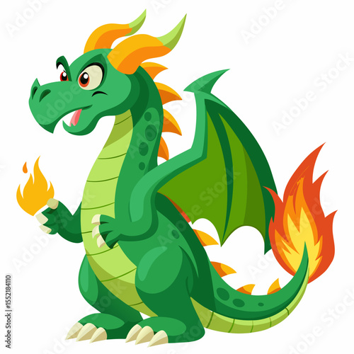 Obraz premium Friendly green cartoon dragon breathing fire with wings and claws