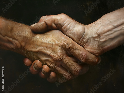 © Georgy, Fototapeta premium Friendly handshake, isolated hands on black background, friends day, friendship