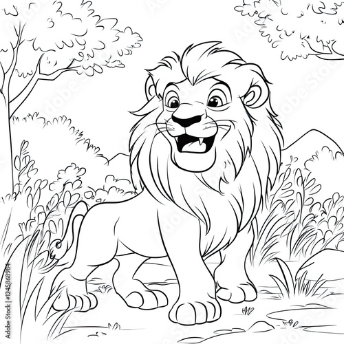 © Dilshad, Obraz premium Friendly Lion Playing in African Savanna Fun Coloring Book Page