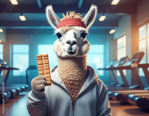 Obraz premium Friendly llama in sportswear holds a granola bar at the gym