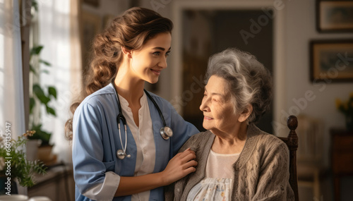 Fototapeta premium Friendly nurse supporting an elderly lady at home.