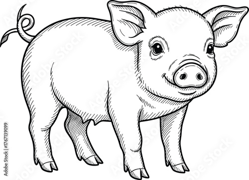 Fototapeta premium Friendly pig illustration, hand drawn farm animal, blue ink sketch, detailed livestock drawing, cute pig artwork, vintage style, rustic charm