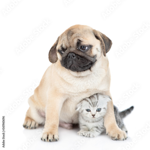 Fototapeta premium Friendly pug puppy hugs tiny scottish kitten. isolated on white background
