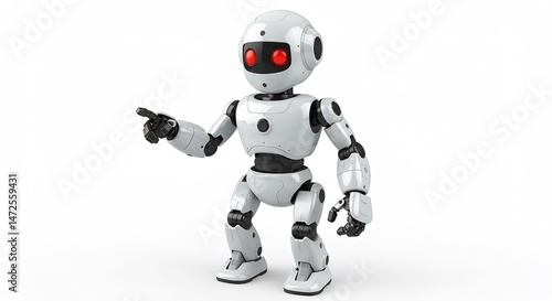 © Duc, Fototapeta premium Friendly robot points confidently against bright white background. AI Generated
