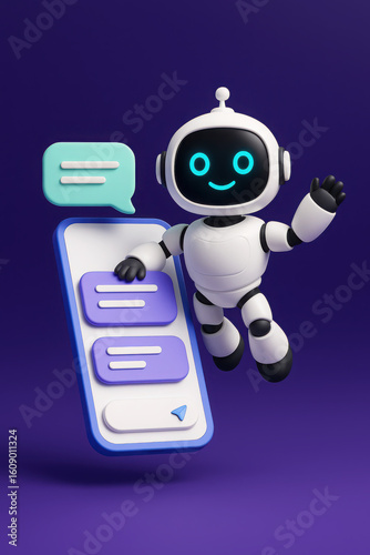 Fototapeta premium Friendly robot with chat bubbles and smartphone artificial intelligence