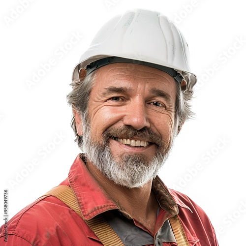 © Saad, Fototapeta premium Friendly smiling construction worker, middle-aged Caucasian man