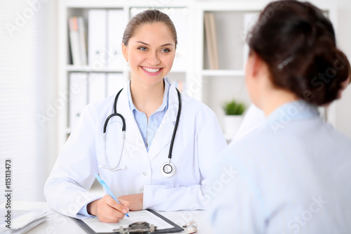 Fototapeta premium Friendly smiling doctor and patient sitting at the table. Very good news...