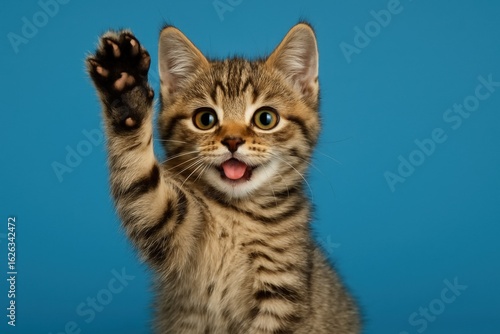 © AI DESIGN 0, Obraz premium Friendly Tabby Kitten Waving Hello on Blue Background