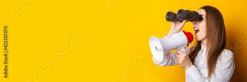 © Alex, Naklejka premium Friendly young woman holds a megaphone in her hands and looks through binoculars on a yellow background. Hiring concept, help wanted. Banner
