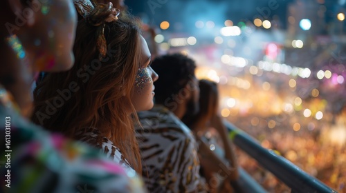 © fotofabrika, Obraz premium Friends enjoying a vibrant festival night with colorful lights and energetic crowd in the background during a summer celebration
